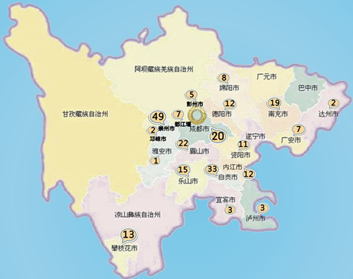 4、从现已收集244家企业和实地调研掌握的情况看,企业区域分布集中度较高的在成都周边地区(大邑、崇州、彭州、新都等共计89家),其次依次为南充地区、自贡、眉山地区、攀枝花、乐山地区及简阳其次。