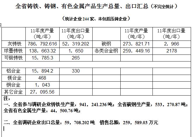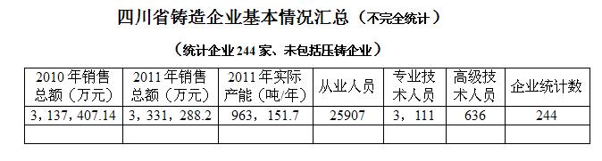 各企业2011年度生产能力、企业性质、从业人员(含技术工人、高、中级技术人员)、产品出口、主要生产设备、环保及能耗相关经济指标、大型国有企业及国有改制企业现有状况及发展情况、铸造园区的规划、四川省铸造行业的发展背景;