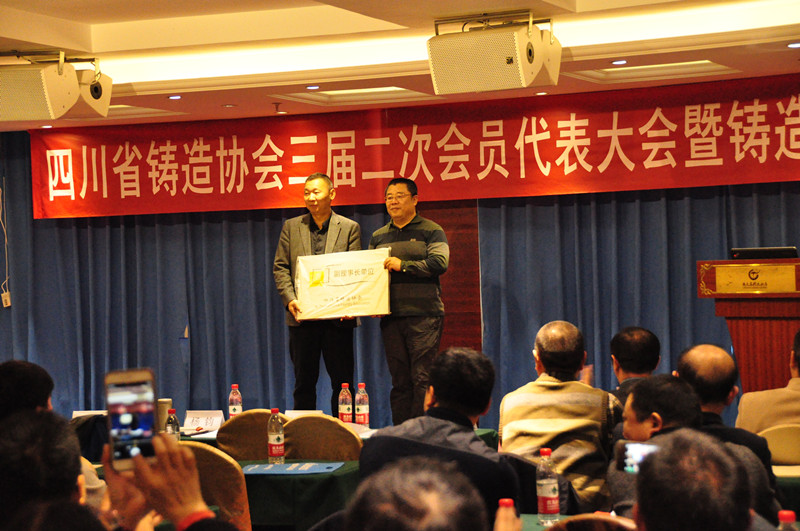 四川省铸造协会杨钧理事长为新增副会长单位绵阳好圣汽车零部件有限公司授牌,该公司代表2015年新会员单位发言