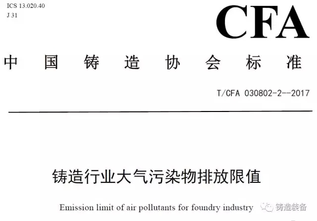 2017年7月31日,由中国铸造协会发布的T/CFA030802-2—2017《铸造行业大气污染物排放限值》(中国铸造协会标准公告 2017年 第06号)发布。该标准于2017年10月1日起实施。